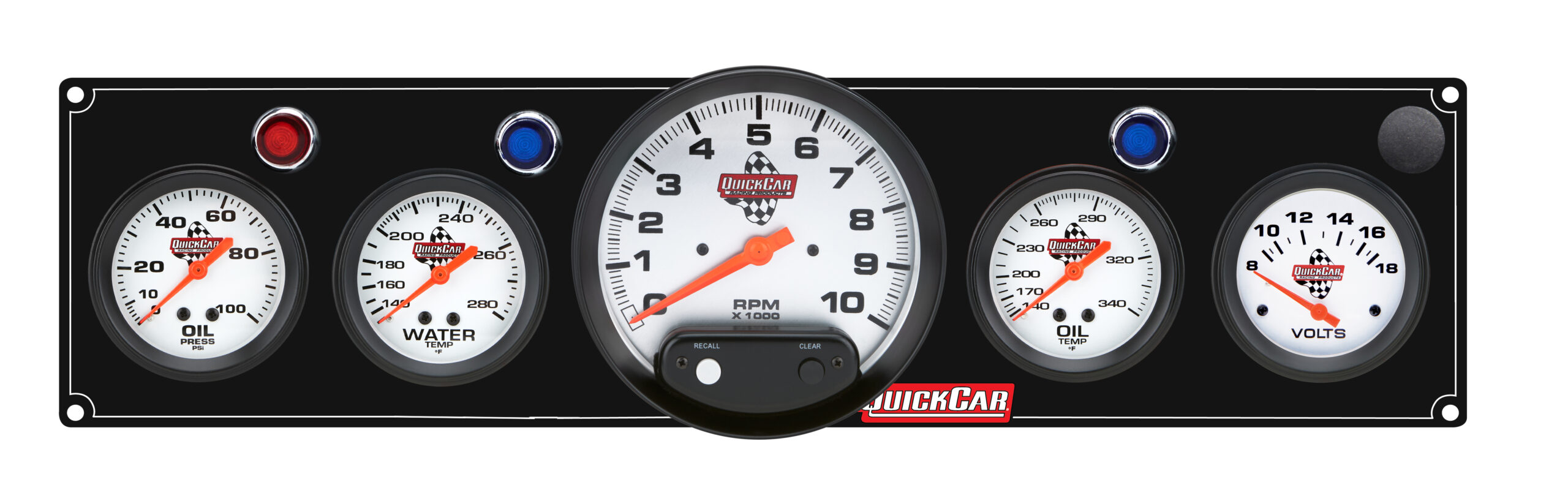 Gauge Panel Assembly – Legend Series – Plain Panel – Oil Pressure / Oil Temperature / Water Temperature / Voltmeter / 5 in Tachometer – 2-5/8 in Diameter – White Face – Warning Light – Kit