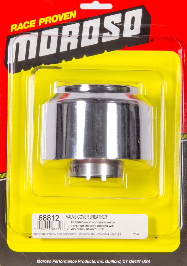 Breather – Clamp-On – Round – 1-1/2 in OD Tube – Reusable – Half Shielded – Moroso Logo – Steel – Chrome – Each