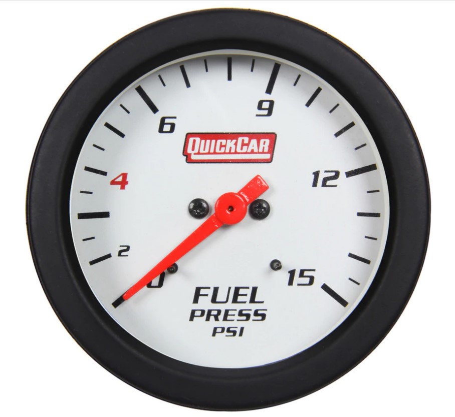 This QuickCar Extreme Series gauge measures fuel pressure. Designed for 12-volt or 16-volt power systems, this 2-5/8″ gauge has a 0-15 PSI display range with a white face, bright red pointer needle, and LED lighting. QuickCar Extreme gauges are top of the line mechanical gauges that feature an internal warning light system where the ENTIRE 2-5/8″ face of the gauge will change color when a problem occurs. Comes with a male 1/8″NPT connection on the backside so it is universal for most cars.