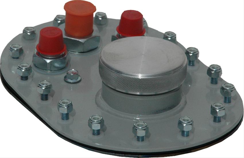Fuel Cell Container Fill Plate, 16-Hole, Offset Threaded Cap, Aluminum, Natural, -10 AN Male Outlet, -8 AN Male Vent, Each