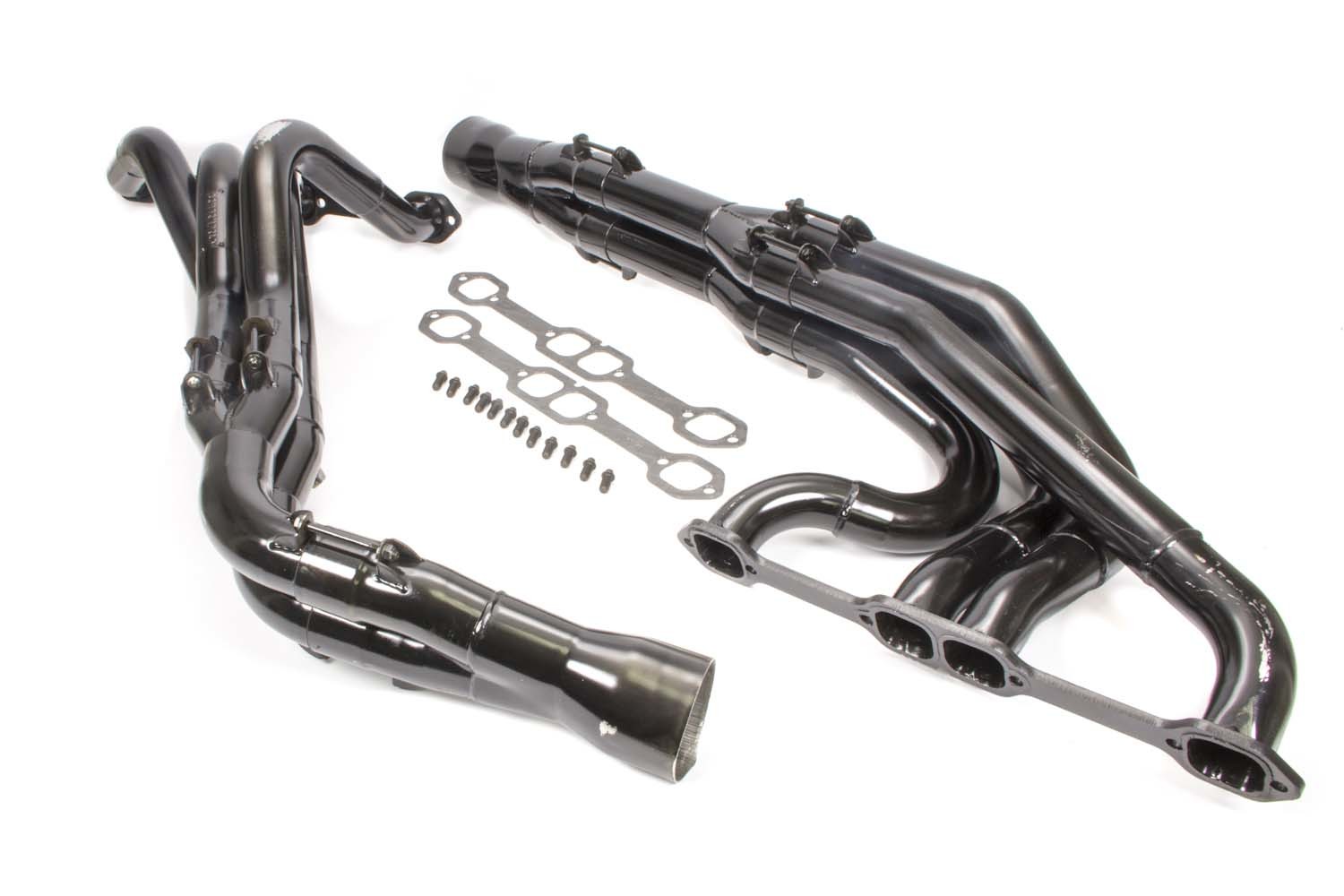 Headers – Dirt Late Model – Tri-Y – Full – 1.875 to 2 in Primary – 3.5 in Collector – Gaskets / Hardware Included – Steel – Black Paint – Small Block Chevy – Pair
