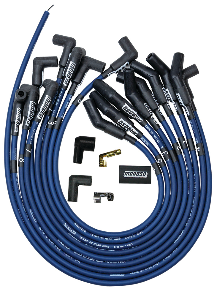 Spark Plug Wire Set – Ultra 40 – Spiral Core – 8.65 mm – Blue – 135 Degree Plug Boots – HEI Style Terminal – Cut-To-Fit – Small Block Ford – Kit